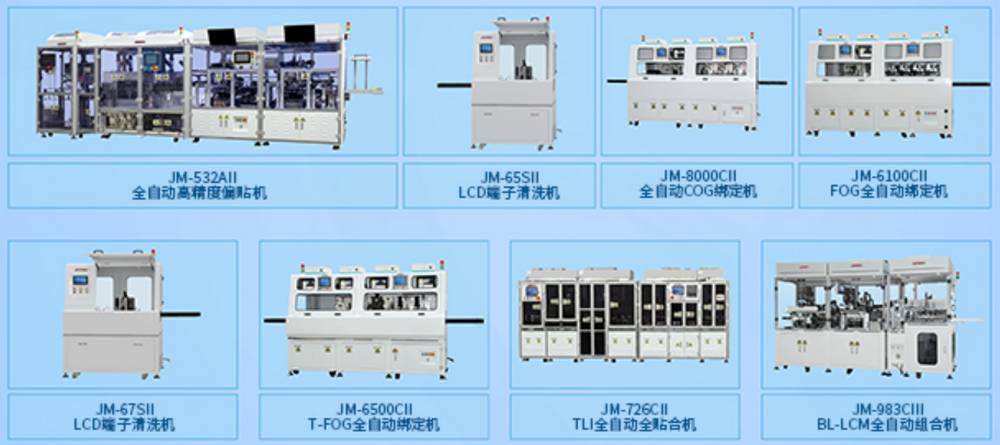 公司的主要產品包括有:COG全自動綁定機、FOG全自動綁定機、T-FOG全自動綁定機、TLI全自動全貼合機、BL-LCM全自動組裝機、背光源全自動疊片機、CCM全自動綁定機、3D貼膜機、脈沖式熱壓機等系列設備。